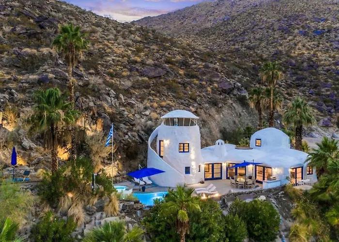 The 3-bedroom Santorini House Panoramic Palm Springs Views Villa is located 4.7 km from DeMuth Park and provides a heated swimming pool, ensuring a relaxing stay. The villa offers guests a relaxing experience with a hot tub.